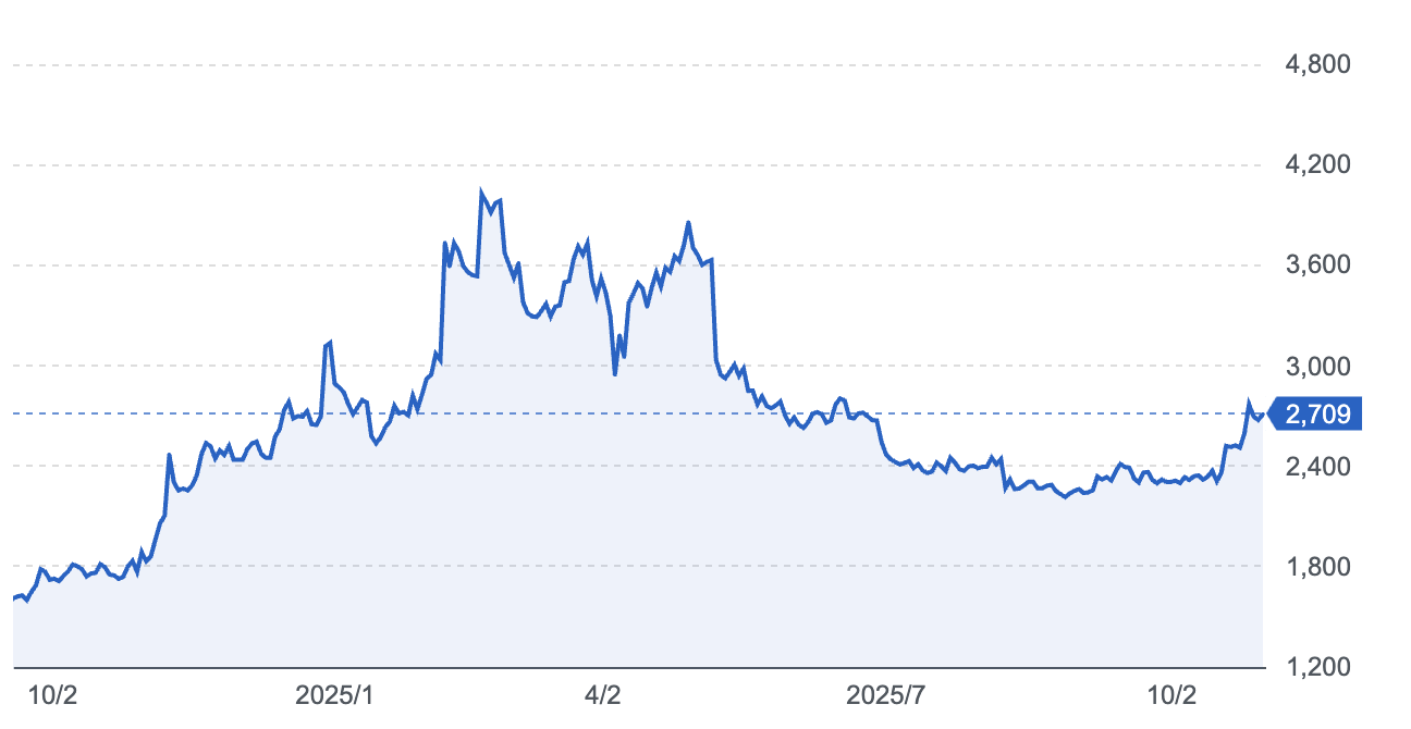 株価は年明けの熱狂感があった頃からはだいぶ落ち着き、1年前からは上がってるものの、ここ数ヶ月は横ばいでした。