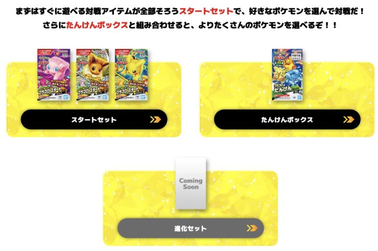 すぐに遊べるスターターセット、キャラコロとエネコロのチップが入っているたんけんボックス、さらに進化後のポケモンを遊べる進化セットが展開される予定です。